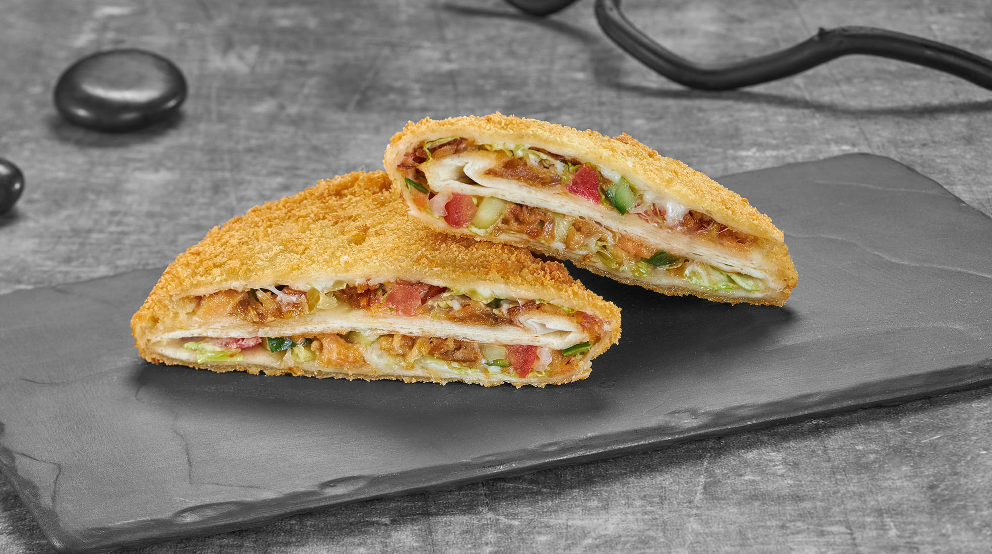 Состав: Лосось, сыр пармезан, огурец, помидор, пекинская капуста, лук фри, тортилья, спайси соус, темпурный кляр, панировочные сухари *Внешний вид блюда может отличаться от фото на сайте.