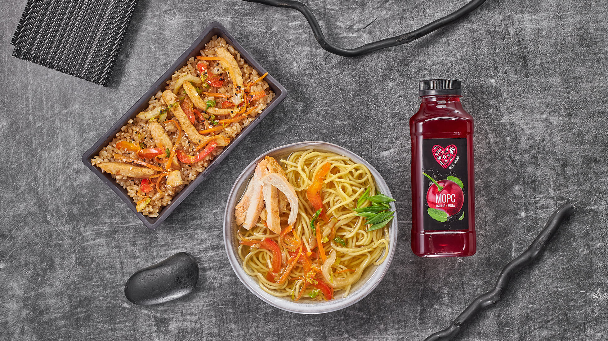 Состав: Суп куриный с овощами, Вок курица с рисом, Морс вишня-мята фирменный *Внешний вид блюда может отличаться от фото на сайте.
