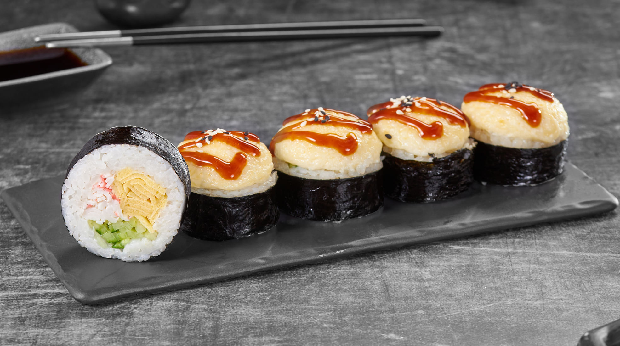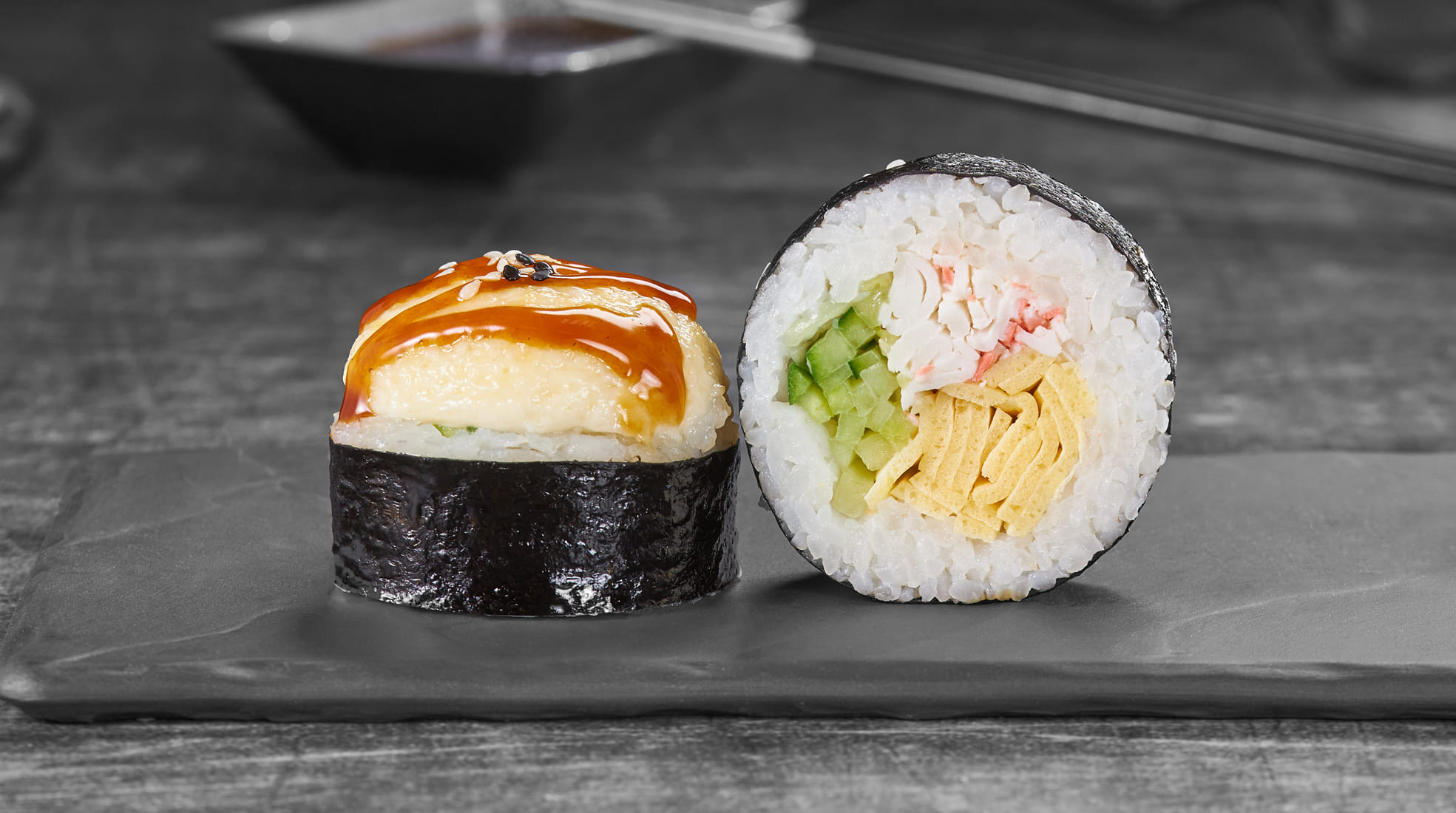 Состав: Блин тамаго, краб-микс соус, японский соус, монако соус, унаги соус, кунжут, огурец, рис, нори *Внешний вид блюда может отличаться от фото на сайте.