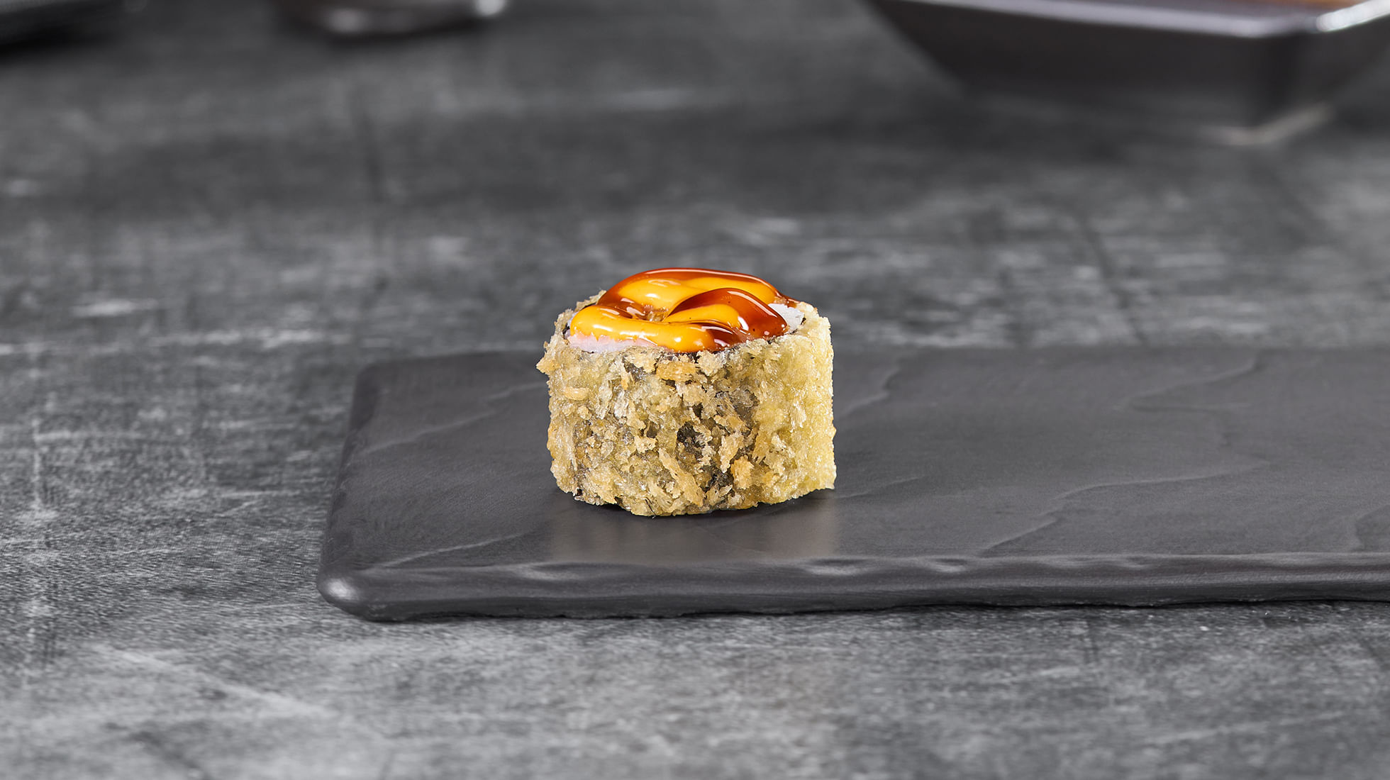 Мини-ролл, который делает большие дела. Лосось терияки, зелёный лучок, хрустящая темпура и соусы спайси с унаги. Маленький, да удаленький.